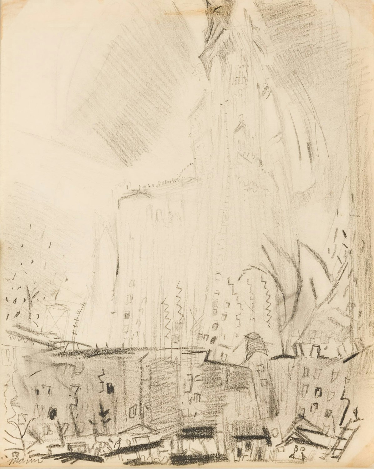John Marin, Untitled (Woolworth Building), 1912–1913, graphite on paper, 9 ½ × 7 ⅜ inches (24.13 × 18.73 cm.), Arkansas Arts Center Foundation Collection: Purchase. 1979.006.001.