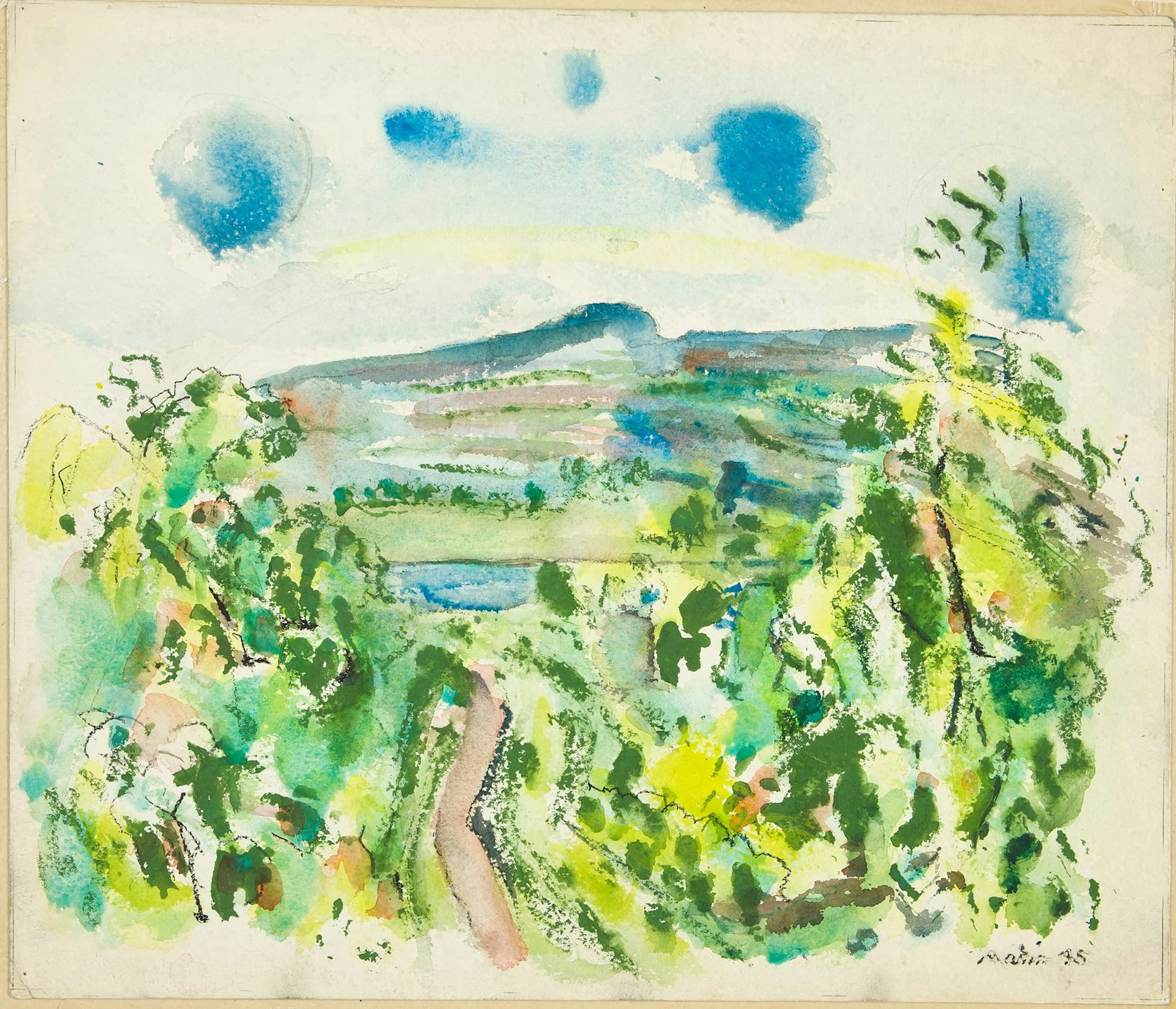 John Marin, Ramapo Mountains, 1945, watercolor and graphite on textured watercolor paper, 15 ¼ × 19 ¾ in. (38.73 × 50.16 cm.), Arkansas Arts Center Foundation Collection: Gift of Norma B. Marin, New York, New York. 2013.018.243