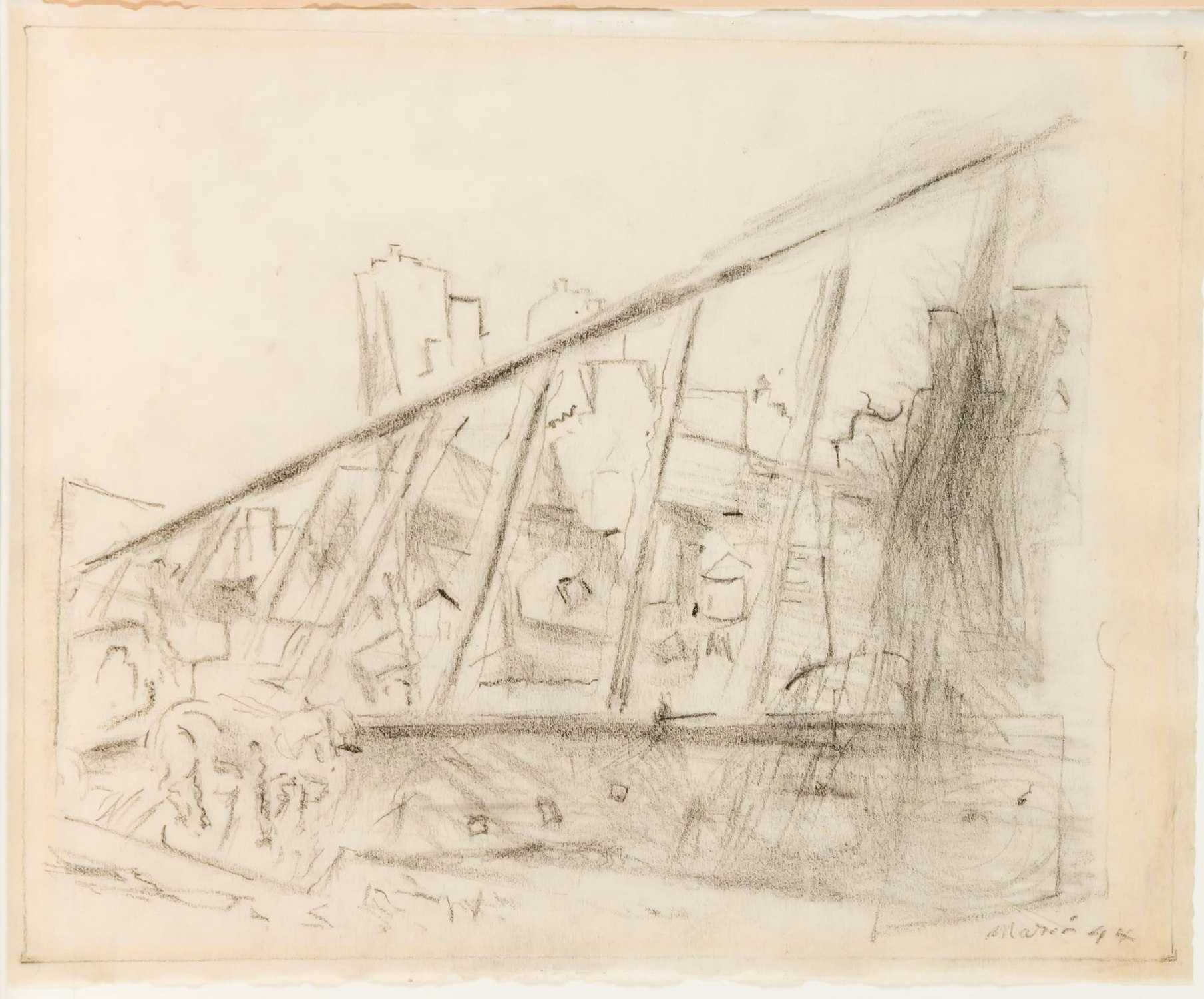 John Marin, Brooklyn Bridge — On the Bridge, 1944, graphite on tracing paper, 6 ⅝ × 8 ⅛ in. (16.83 × 20.64 cm.), Arkansas Arts Center Foundation Collection: Gift of Norma B. Marin, New York, New York. 2013.018.210