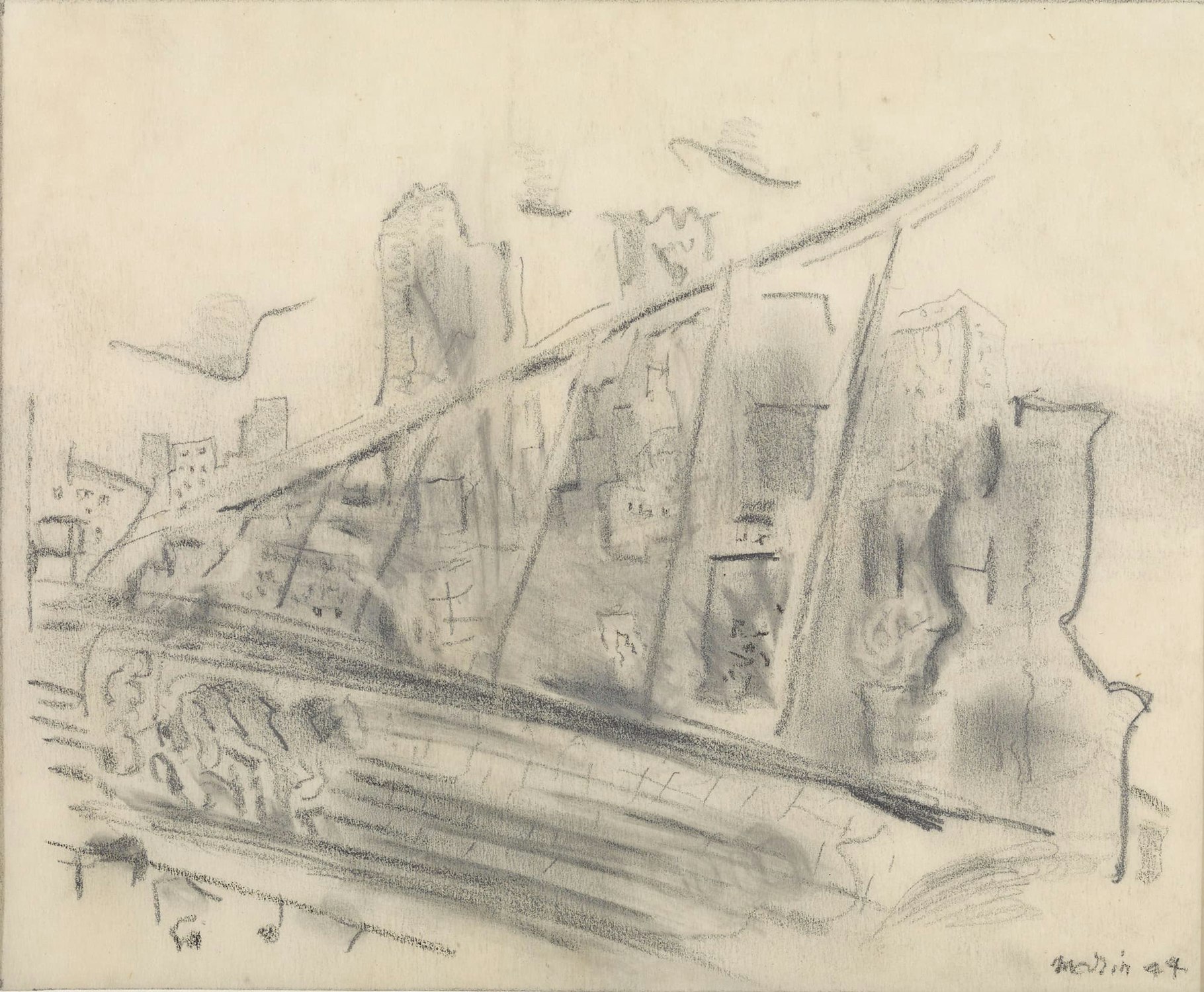 John Marin, Brooklyn Bridge, On the Bridge, 1944, graphite and charcoal on paper, 6 ¼ × 7 ⅞ inches (15.88 × 20 cm.), Colby College Museum of Art, 1973.053