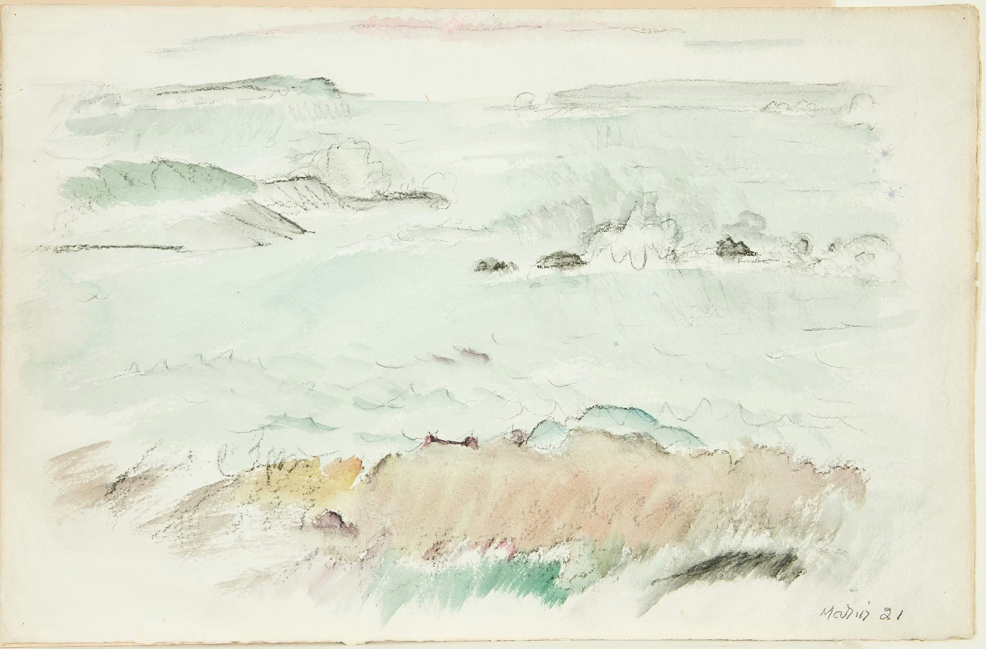John Marin, Small Point, Maine, 1921, watercolor and charcoal on textured watercolor paper, 14 ½ × 22 ⅜ in. (36.83 × 56.83 cm.), Arkansas Arts Center Foundation Collection, Gift of Norma B. Marin. 2013.018.024