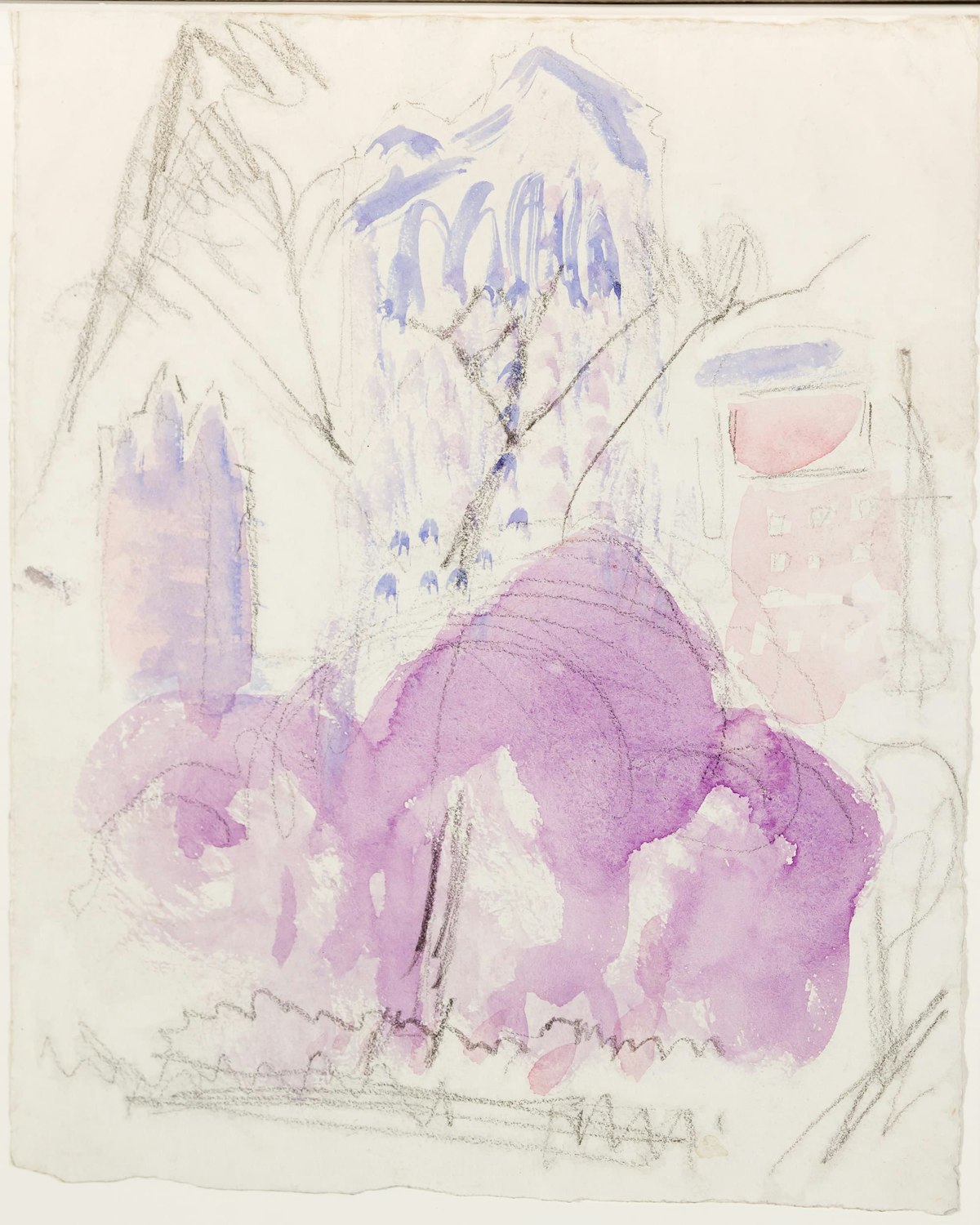 John Marin, City Hall Park, Manhattan, circa 1912, watercolor and graphite on watercolor paper, 9 ⅝ × 7 ¾ in. (24.45 × 19.68), Arkansas Arts Center Foundation Collection, Gift of Norma B. Marin. 2013.018.165