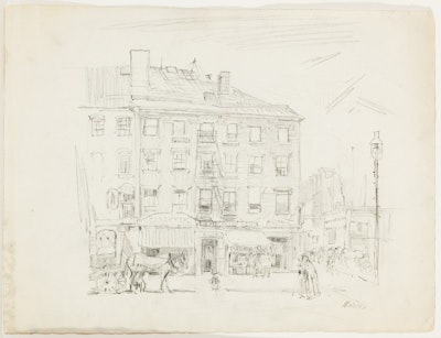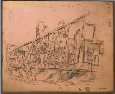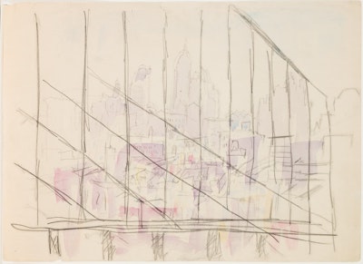 In later years, Marin continued to search for new ways to represent the dynamic power of the bridge and the way it interacted with the buildings around it and the people on it. He made numerous rough sketches that appear to have been made on the spot as he walked back and forth across the bridge.