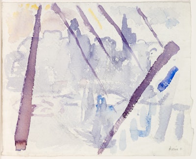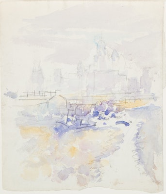 John Marin, River Movement, Manhattan Skyline, 1910-1912, graphite and watercolor on textured watercolor paper, 12 ¾ × 10 ¾ in. (32.38 × 27.30 cm.), Arkansas Arts Center Foundation Collection, Gift of Norma B. Marin, New York, New York. 2013.018.154