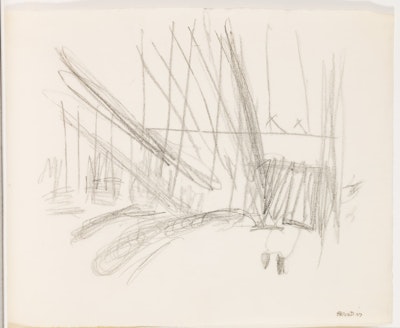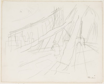 John Marin, On the Brooklyn Bridge, circa 1920, graphite on paper, 6 ⅞ × 8 ½ in. (17.46 × 21.59 cm.), Arkansas Arts Center Foundation Collection: Gift of Norma B. Marin, New York, New York. 2013.018.117