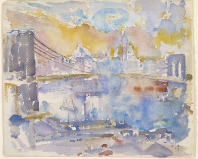 John Marin, Brooklyn Bridge, 1912, watercolor and graphite on paper, 15 ½ × 18 ½ inches (39.37 × 46.99 cm.), Colby College Museum of Art, Gift of John Marin Jr. and Norma B. Marin, 1973.042, SR.12.12