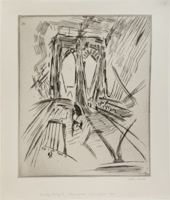 John Marin, Brooklyn Bridge, No. 6 (Swaying) Six, New York Etchings, 1913, etching, plate: 10 ¾ × 8 ⅞ inches (27.3 × 22.5 cm.), sheet: 13 1/16 × 11 ⅛ inches (33.2 × 28.3 cm.), Philadelphia Museum of Art, Purchased with the Lola Downin Peck Fund from the Carl and Laura Zigrosser Collection, 1967, 1967-31-99, CZ.112, Copyright: © Estate of John Marin / Artists Rights Society (ARS), New York