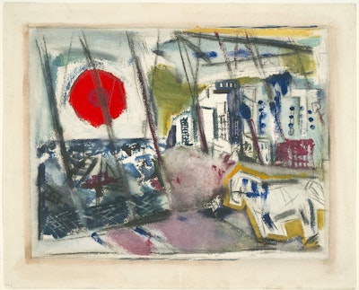 Marin’s modernist productions during his early years back in New York showed his continuing fascination with the great bridge and the active city around it. He often caught dramatic natural light at work in sunrises and sunsets.