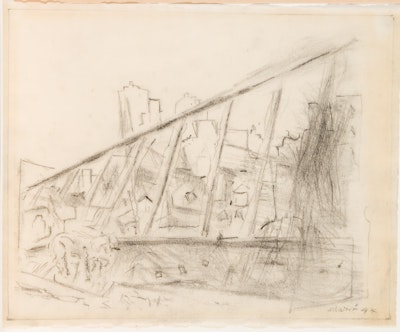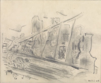 John Marin, Brooklyn Bridge, On the Bridge, 1944, graphite and charcoal on paper, 6 ¼ × 7 ⅞ inches (15.88 × 20 cm.), Colby College Museum of Art, 1973.053
