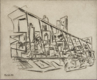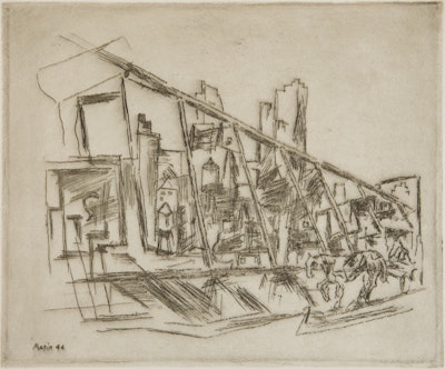 The etchings that Marin made of the Brooklyn Bridge in 1913 were among his most innovative modern images of New York. The “great movement” and “forces at work” in the city that Marin described in his 1913 commentary are brought to life in the heaving forms and dynamic line work of Brooklyn Bridge No.6 (Swaying).