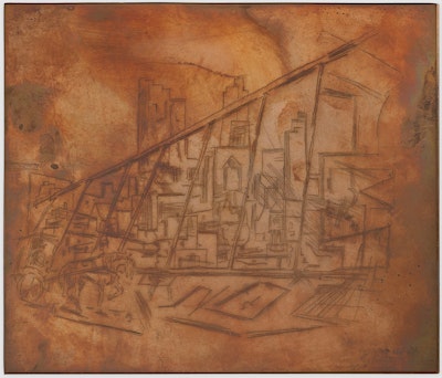John Marin, Brooklyn Bridge — On the Bridge, No. 1, 1944, copper etching plate: 6 ⅜ × 7 ¾ inches (16.2 × 19.7 cm), Philadelphia Museum of Art, Gift of Norma Marin, 1997, 1997-189-50, Copyright: © Estate of John Marin / Artists Rights Society (ARS), New York