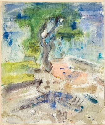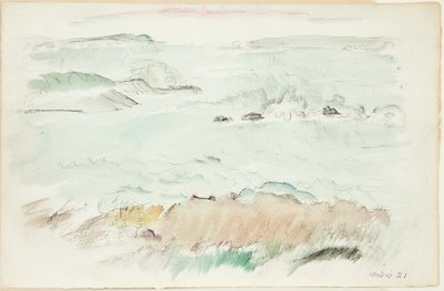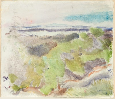 A pine-grown rock outcropping on top of Morse Mountain in Small Point, Maine, became one of John Marin’s favorite places for painting during his early years summering in Maine. He returned to this exact point of view many times. The scrubby pines that clung to the rock became regular characters in the artist’s watercolors.