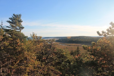 The spectacular point of view from little Morse Mountain includes the rocks and pine trees in the foreground, a stretch of salt marshes in the middle ground, further small mountains in the background, and a beach where breakers crash at the left.