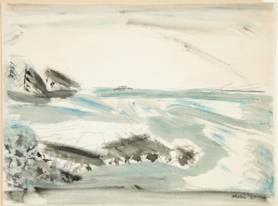 Maine was a place of creative magic for John Marin. At the suggestion of his friend, the etcher Ernest Haskell, Marin traveled from his home in New Jersey to Maine for the first time in the summer of 1914. He painted along the coast of West Point, near Phippsburg. As he worked, he fell in love with the New England state. Even grey days of rain and fog enchanted Marin.